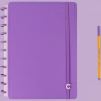 ⋆ Grande: Capa e contracapa rígidas, 01 bolsa plástica, 01 folha de instrução de uso e manuseio, com refis e acessórios da marca disponíveis no verso, 01 folha de identificação com calendário no verso, 04 divisórias com abas para identificação (02 pretas e 02 transparentes), 80 folhas offset 90g (60 folhas pautadas e 20 folhas lisas brancas para impressão), 01 suporte com elástico para 01 caneta ou 01 lápis e discos M + elástico.